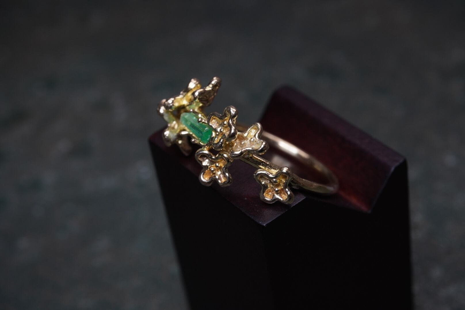 エメラルド原石を金木犀で飾った指輪です。